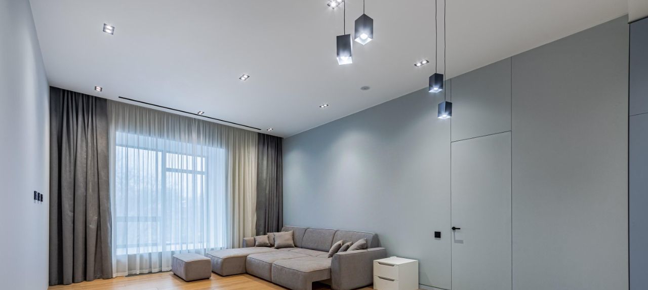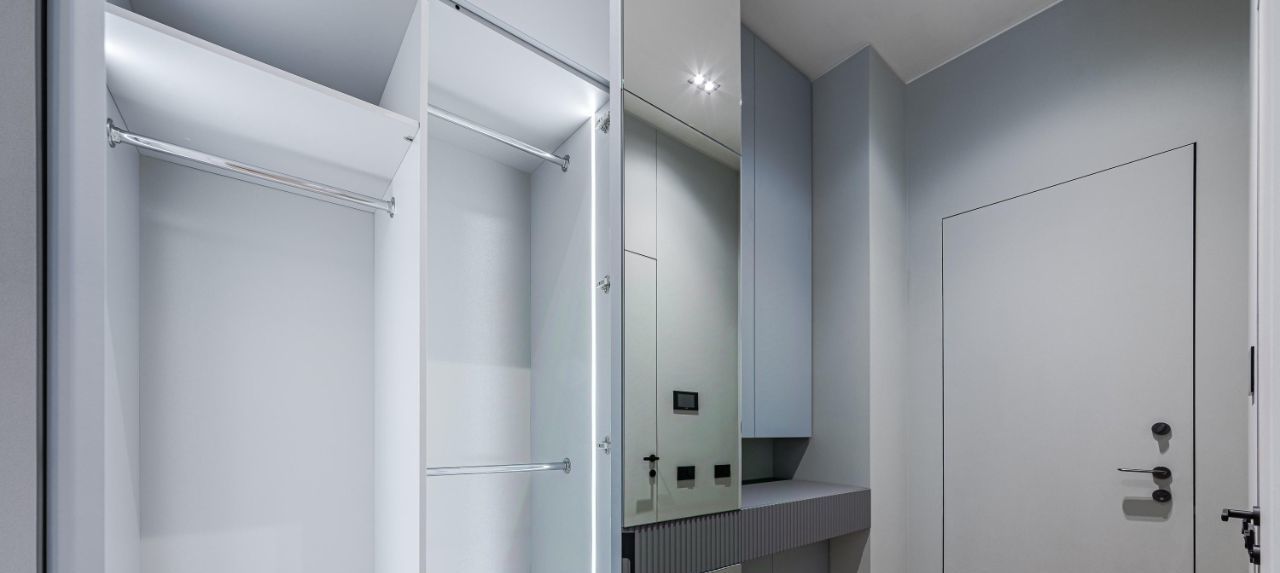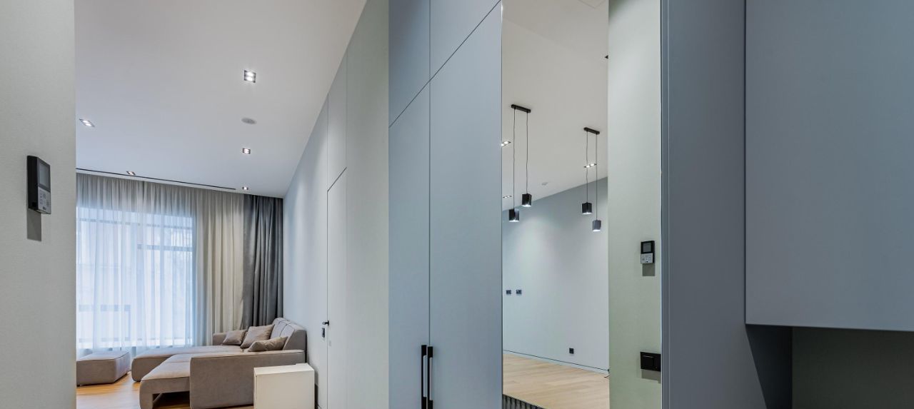 Апартаменты общей площадью 73,6 метров расположены в секции А. Выполнена дизайнерская отделка от застройщика и улучшенная собственником в светлых бежевых и оливковых тонах.
