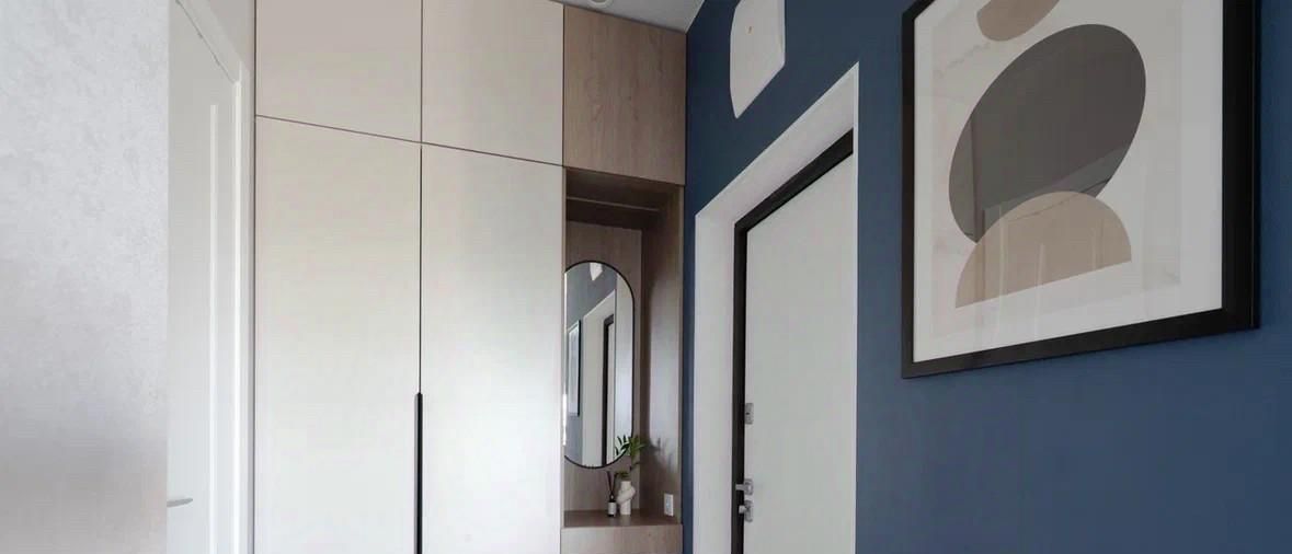 - встроенная мебель на заказ с грамотным зонированием: рабочая зона, зона релакса и отдыха, зона сна; предусмотрено много мест для хранения, ортопедические диван и матрас;