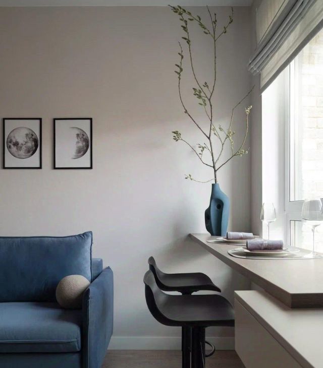 - барный стол перед окном в гостиной: утром место для чашки кофе и завтрака с панорамным видом с 16 этажа на Тропаревский лесопарк. Для приема гостей предусмотрен стол-трансформер, раскладывающийся из журнального в обеденный до 10 персон;