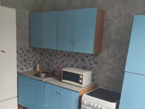 В комнате-стенка,диван 2х спальный,телевизор,стол.В другой комнате-диван 2х спальный,шкаф-купе.Кухня встроенная под единой столешницей с барной стойкой ( в светлых тонах).стол обеденный со стульями,вся техника включая холодильник 2х камерный,морозильная камера,микроволновка.Санузел раздельный евростандарт.