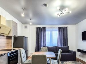 Полностью укомплектована и готова к проживанию (со своей мебелью нельзя). Одно просторное открытое пространсво. Спальня отгорожена от зоны гостиной-кухни откатными дверями и тяжелыми шторами.