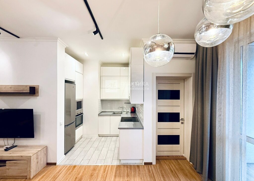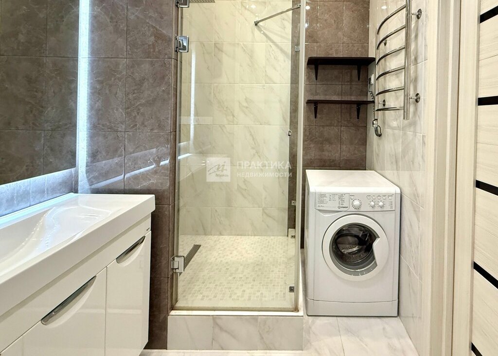 Современная планировка: кухня-гостиная с большой лоджией, спальня с гардеробной, санузел с душевой кабиной, большая гардеробная в прихожей. Лоджия: застеклена, есть теплый пол, освещение.