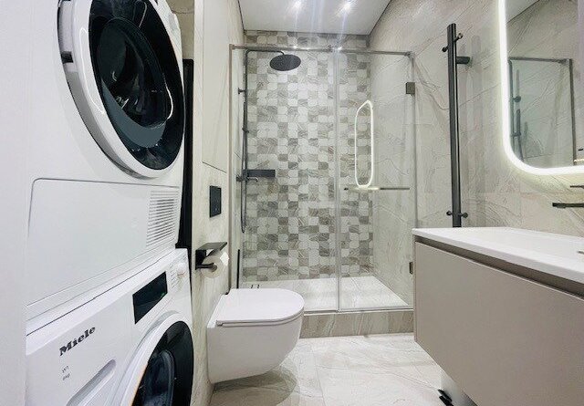 Есть постирочная зона и гардеробная.
