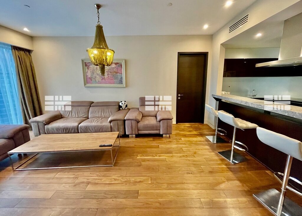 Функциональная планировка: просторная гостиная совмещенная с кухней и обеденной зоной, спальня с собственной гардеробной комнатой и мраморной ванной комнатой, прихожая, прачечная, холл и гостевой санузел.