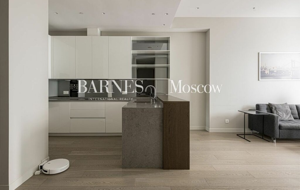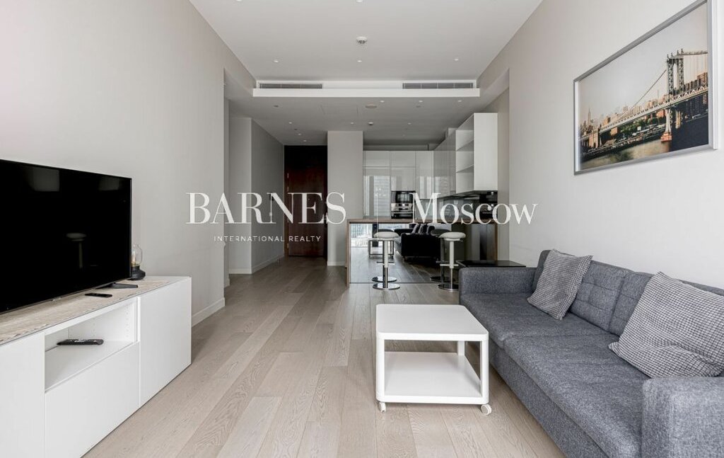 В апартаменте выполнена современная и стильная отделка. Функциональное планировочное решение: просторная гостиная с зоной кухни, спальня, гардеробная, санузел.