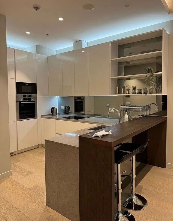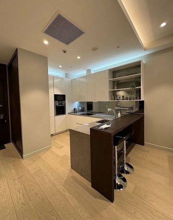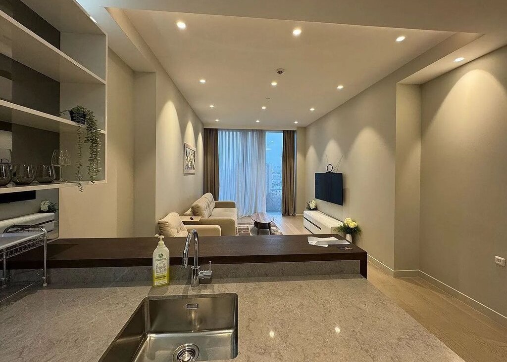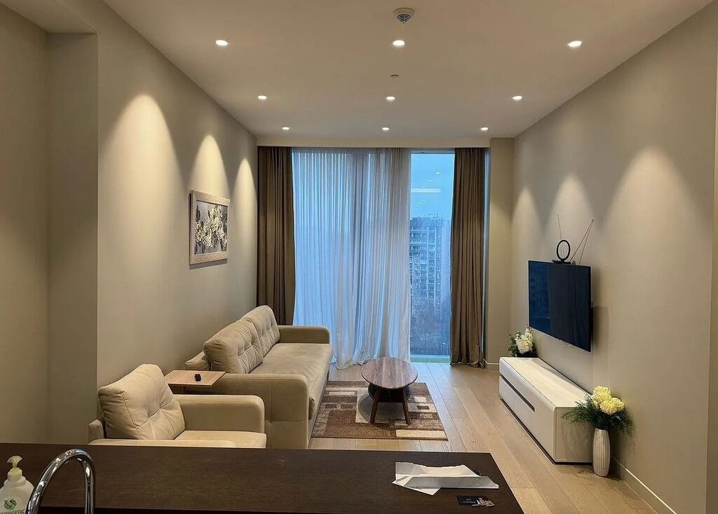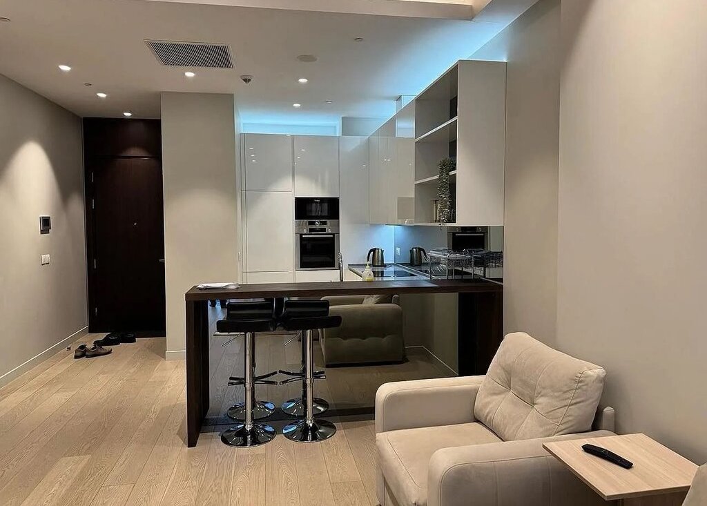Функционaльныe апартаменты с современной отделкой, панорамным остеклением, уютным интерьером, полностью укомплектованы бытовой техникой. Планировка: гостиная с кухней с барной стойкой, 1 спальня, ванная с сантехникой, холл с гардеробными. В ночное время огни небоскребов никого не оставят равнодушными.