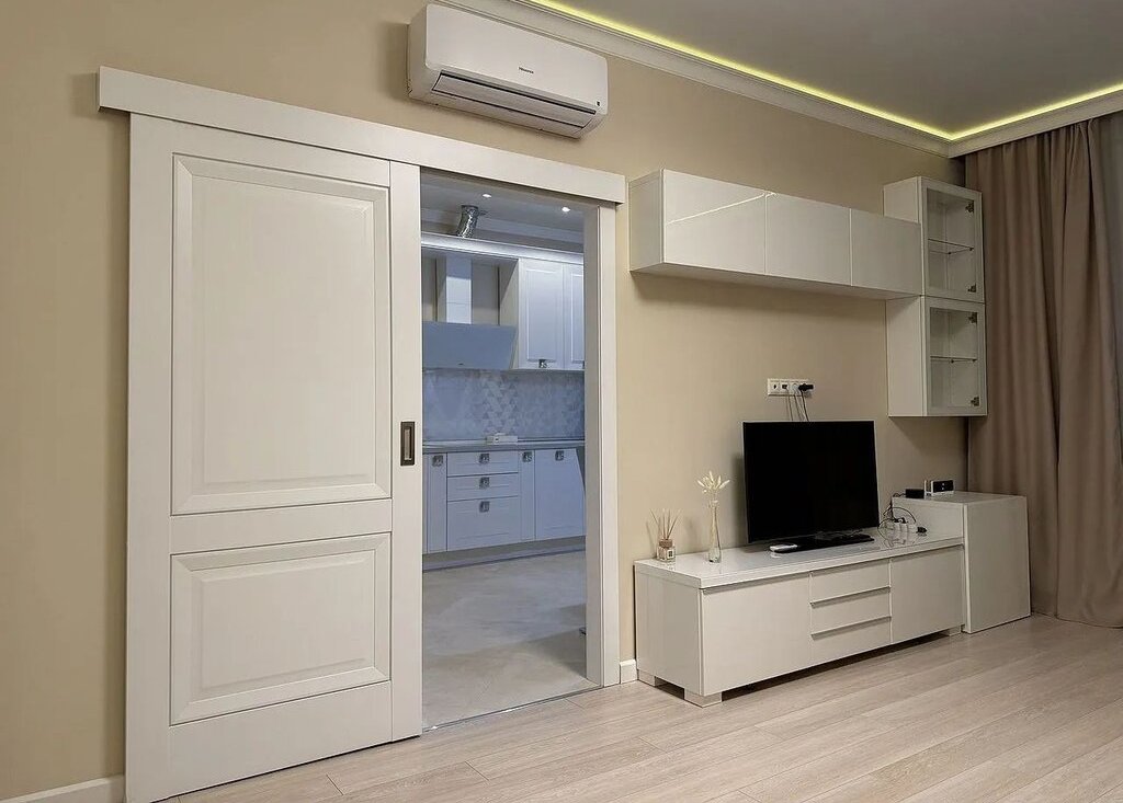 Просторная квартира с изолированной спальней и выходом на балкон, гостиная с выходом на кухню, большая прихожая, ванна и с/у раздельные, гардеробная комната с зонами для хранения!