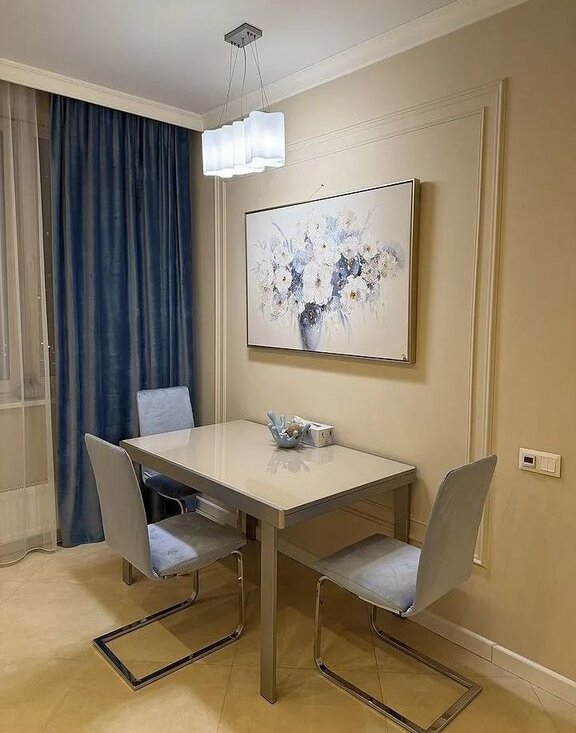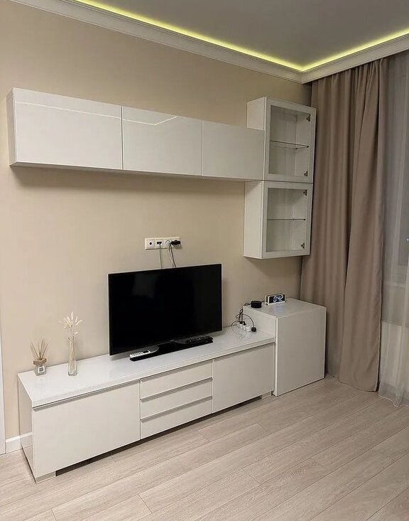 Полностью мебелированна для удобства проживания, в том числе бытовой техникой (стиральная машина, телевизор, холодильник, микроволновка, духовка, посудомойка, плита, вытяжка, чайник, гладильная система, сейф, кондиционер).