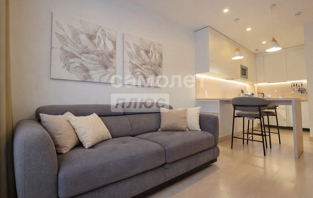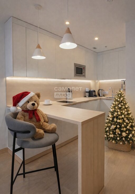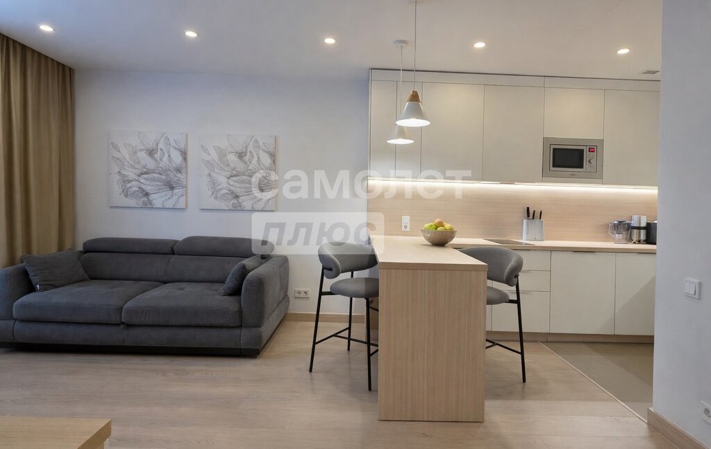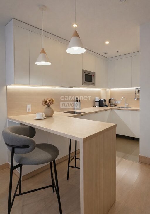 Барная стойка выполняет сразу несколько функций — место для завтраков, работы за ноутбуком или спокойного ужина. Подвесные светильники добавляют мягкий свет и делают пространство особенно уютным в вечернее время.