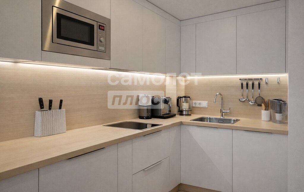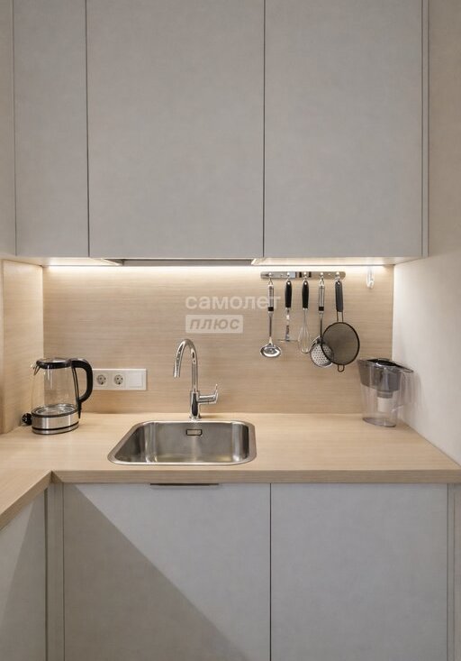 Кухня выполнена в современном минималистичном стиле — светлая, аккуратная и визуально лёгкая. Фасады без лишних деталей, встроенная подсветка рабочей зоны и продуманная геометрия создают ощущение порядка и уюта.