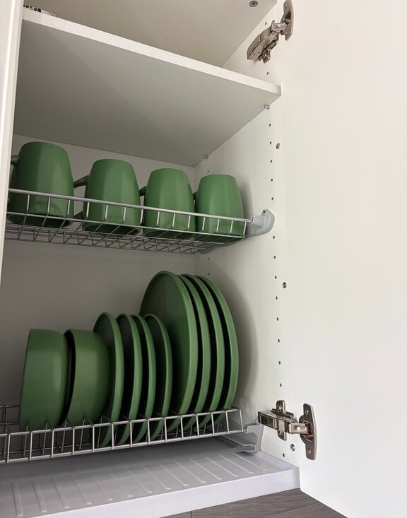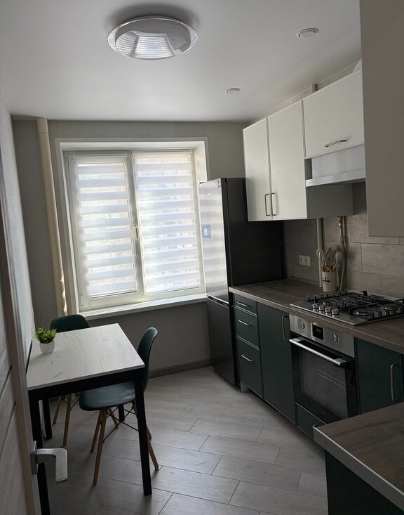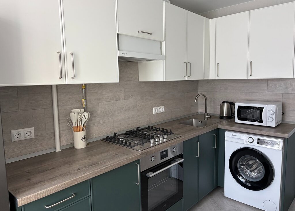 Техника: варочная панель, духовой шкаф, большой холодильник (300 л), стиральная машина, микроволновая печь, чайник