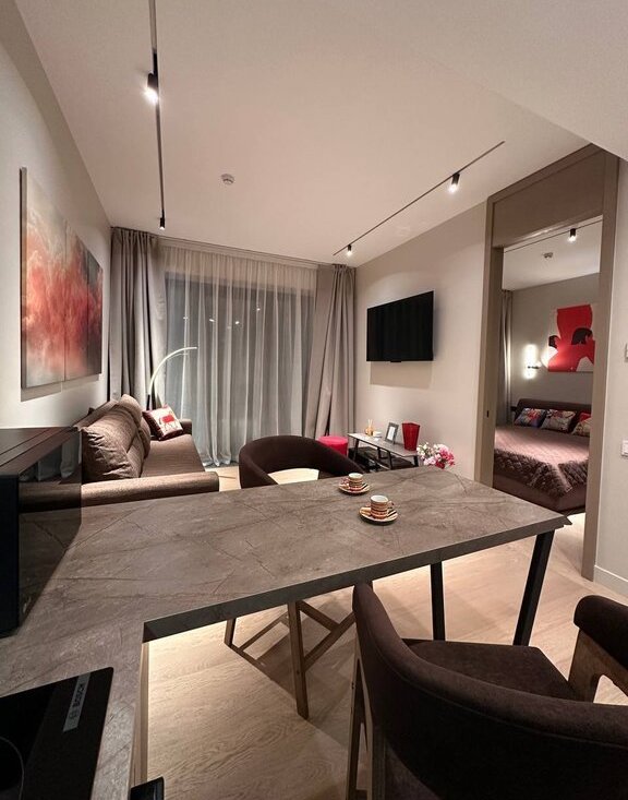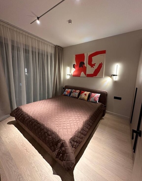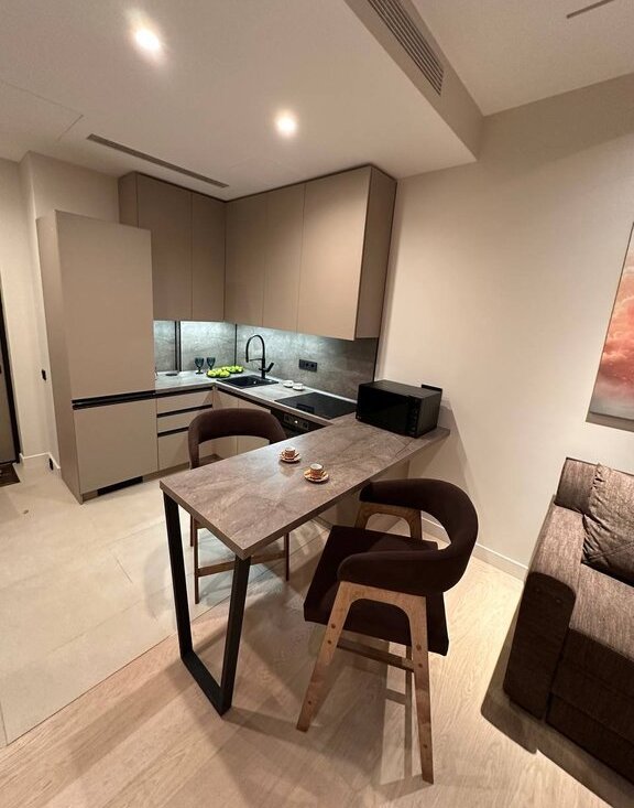 Квартира полностью укомплектована всей мебелью и бытовой техникой. К системе умный дом подключены телевизоры, водонагреватель, карнизы, свет, отопление, кондиционер и т.д.