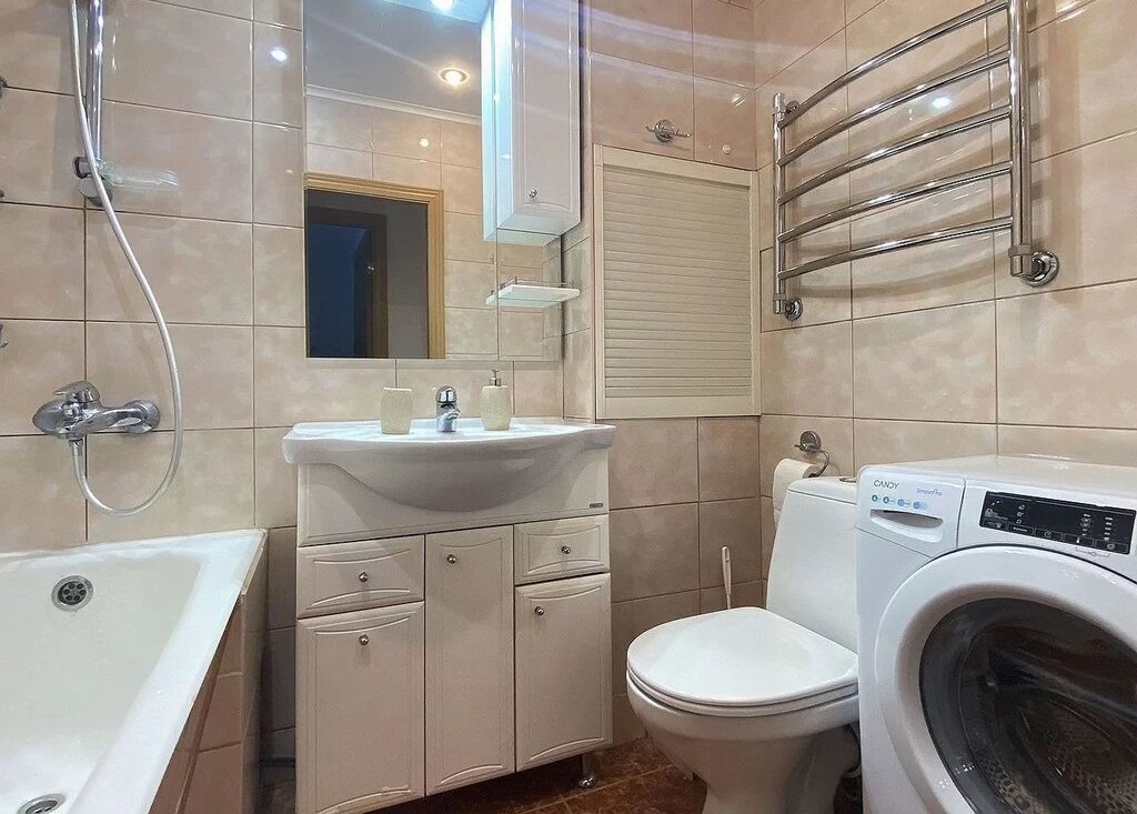 Совмещенный санузел с ванной. Стиральная машина Саndy.