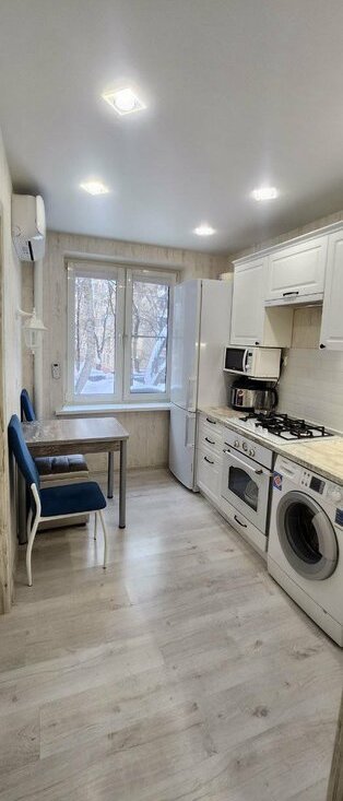 В квартире остаётся: встроенная кухня с бытовой техникой (кондиционер, холодильник, стиральная машина, варочная газовая панель, электрический духовой шкаф, микроволновка), угловой диван, двухспальная кровать, шкаф-витрина и тумба, прихожая, эл.полотенцесушитель.