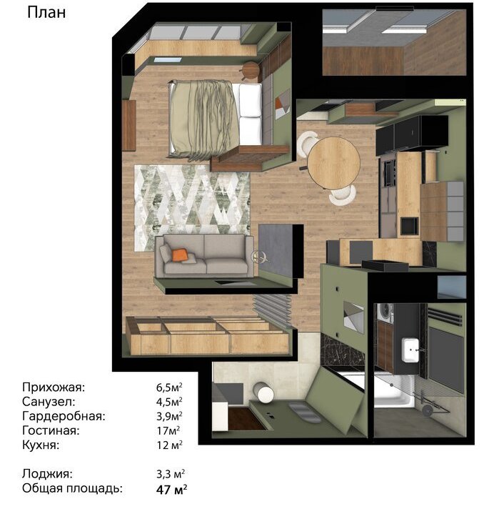 Утепленная лоджия с теплым полом. Широкие подоконники в зале и на кухне выполнены из дерева. Кровать с подъёмным механизмом, диван раскладывается в стандартное спальное место, в нем предусмотрены ящики для белья. Матрас анатомический с эффектом памяти. В ванной душ с термостатом. На полу керамогранит и ламинат.