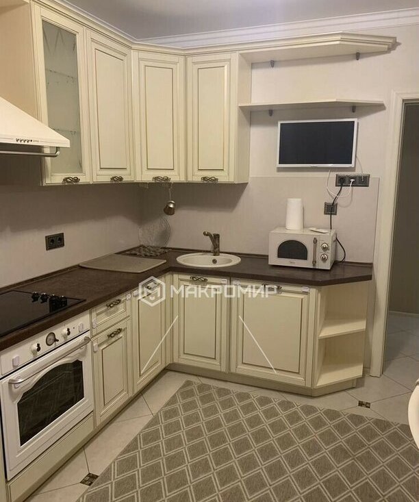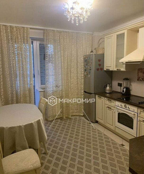 Просторную кухню площадью 12,5 кв. м, оснащенную всей необходимой бытовой техникой (холодильник, микроволновая печь и др.).