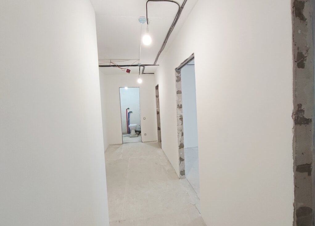 В квартире выполнены все "грязные" работы: стяжка пола, штукатуркой выравнены по маякам все стены, шпаклёвкой подготовлены стены под обои, потолок обработан грунт-краской, проведены сантехника и электрика. Ремонт выполнен из качественных материалов. Фотографии реальные, без фильтров и улучшений.