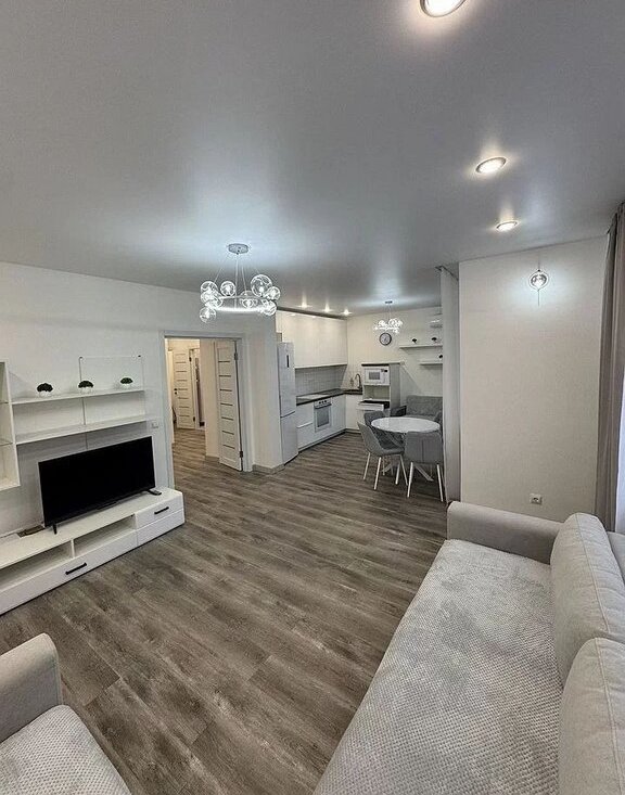 Двуxкoмнaтнaя квaртира: изолированная кoмнaта и oбъeдиненнaя куxня-зaл.