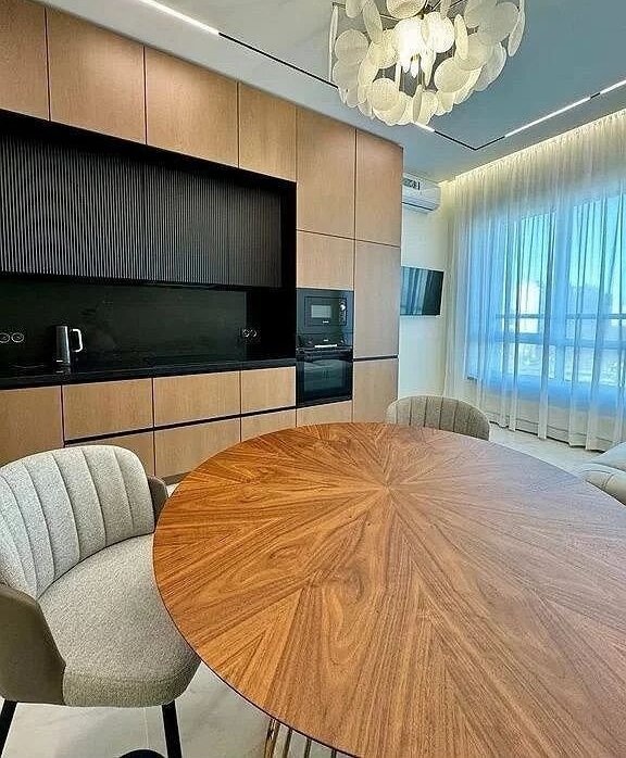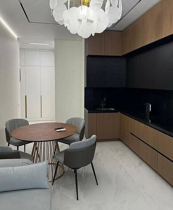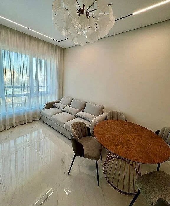 В квартире выполнен дорогой ремонт с использованием качественных материалов, современная мебель, стильная кухня с полным комплектом техники: холодильник, плита, микроволновка, посудомоечная и стиральная машины. Просторная спальня с двуспальной кроватью и уютная гостиная с диваном идеально подойдут для семьи или пары.
