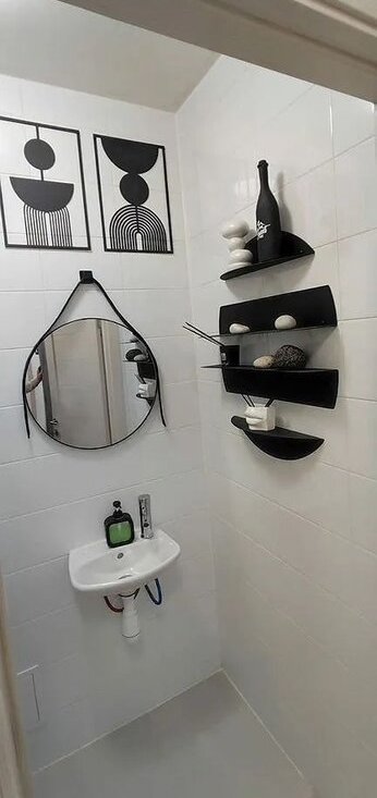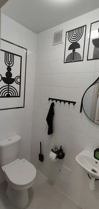 Caнузeл cовмещённый, офopмлeн cтильными элeментами декора, всего 2 санузла (1 санузел -туалет, раковина, ванна; 2 санузел -туалет, раковина)