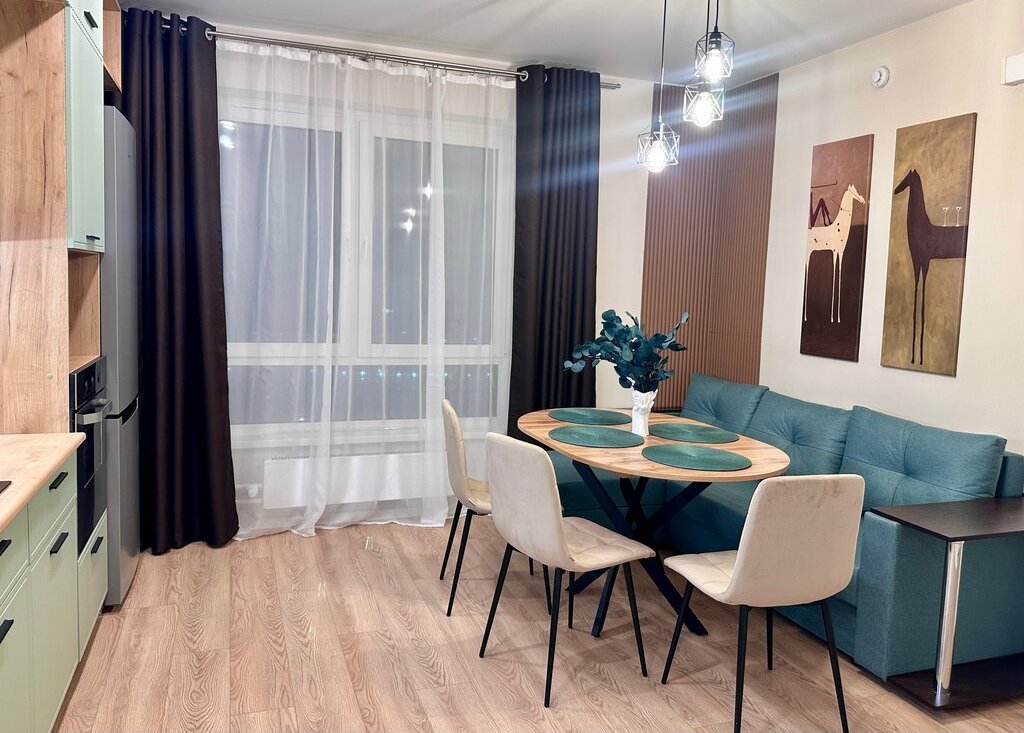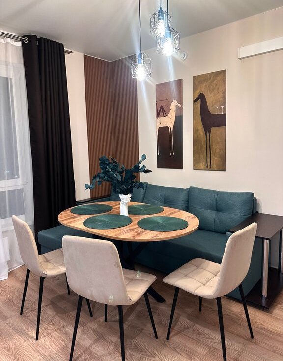 На кухне - гостиной стоит диван, удобный стол для 4-6 человек. Тут очень комфортно и для готовки, и для приема гостей, и для семейного отдыха.