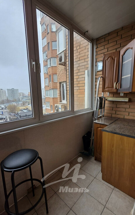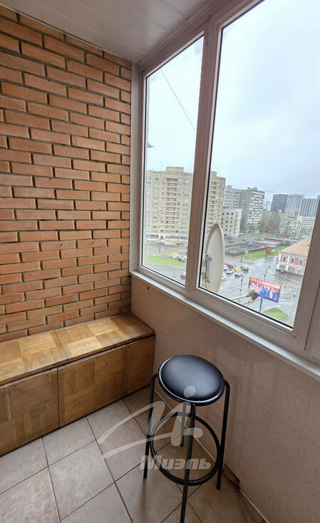 Застекленная лоджия с зоной для отдыха, а так же шкафчики для хранения.