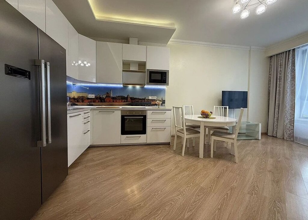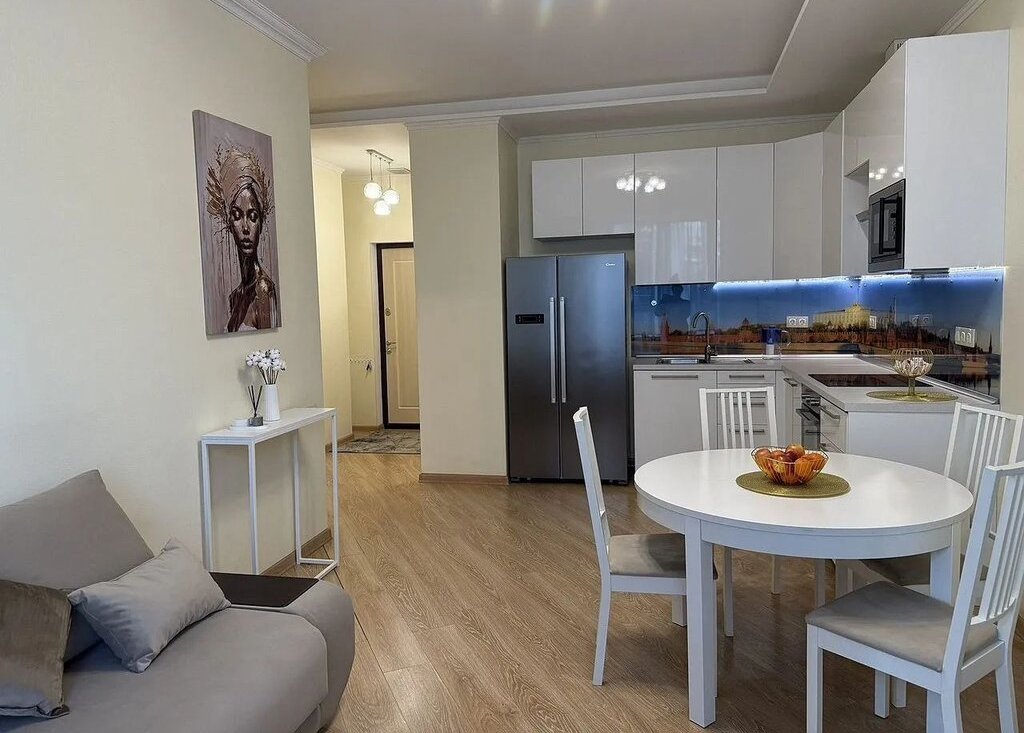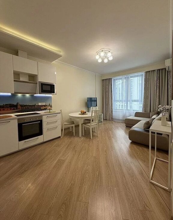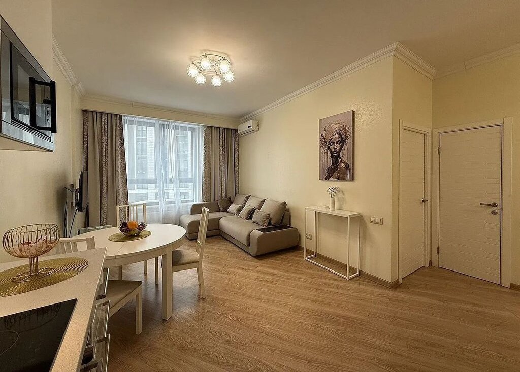 Уютная гостиная с функциональным диваном и стильная кухня с качественной бытовой техникой наполнит Вас приятными чувствами. Есть вместительная посудомоечная машинка.