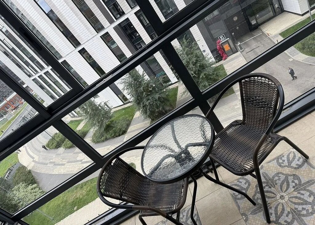 Балкон с панорамными окнами также наполняет комнату светом. Кофейный столик со стульями даёт возможность порелаксировать за чашечкой кофе, а можно и поработать за ноутбуком в тёплое время года.