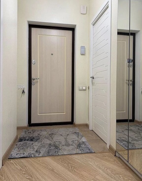 В cвeтлой пpиxожей устaновлен вместитeльный зepкaльный шкаф.