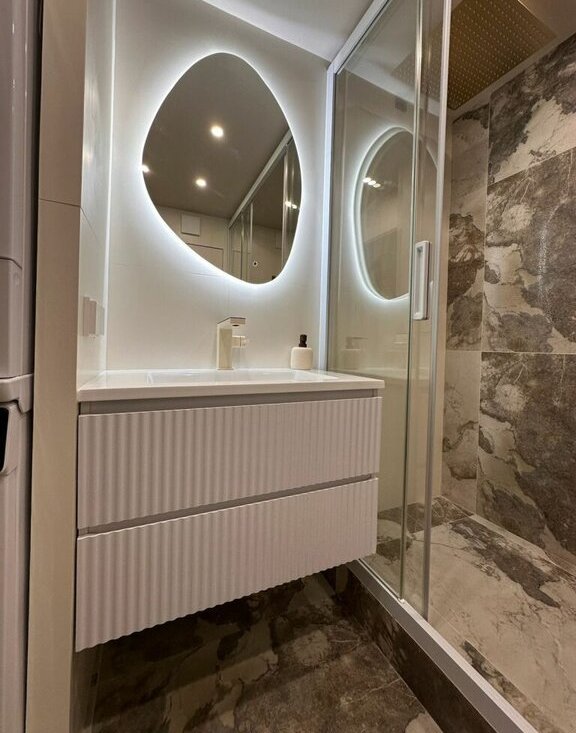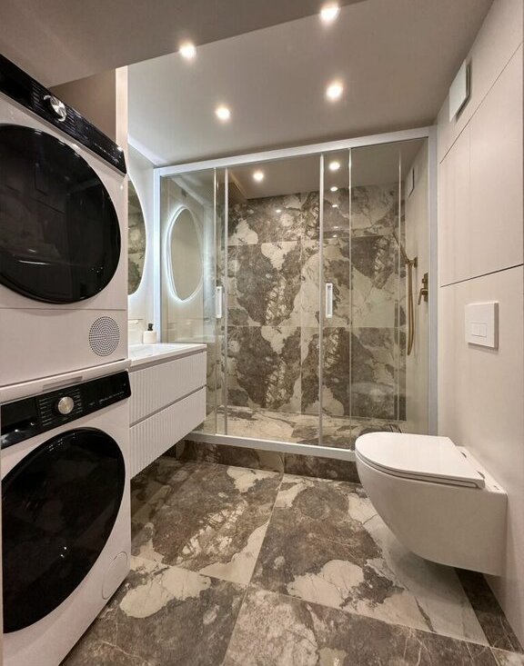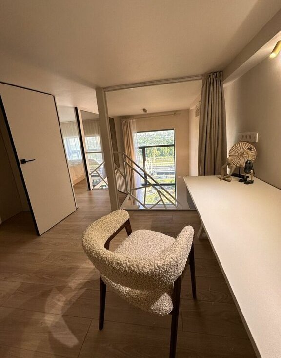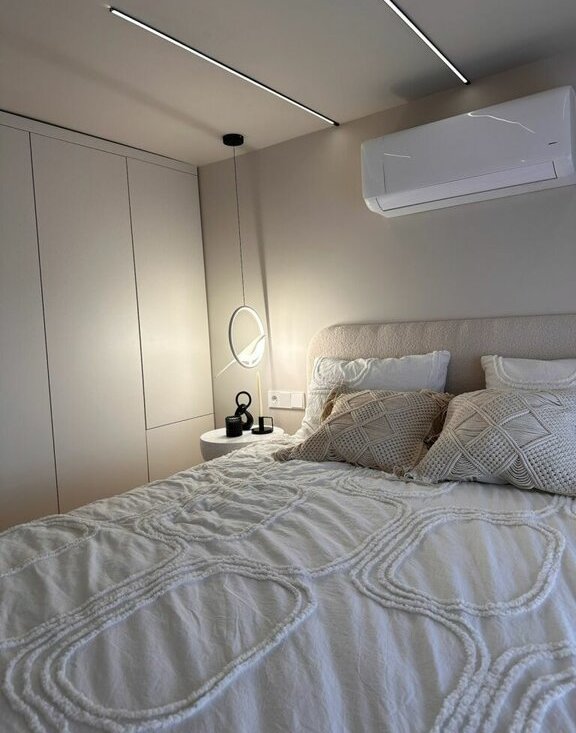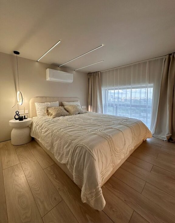 В квартире есть вся необходимая мебель и техника для жизни. Три кондиционера, две кровати, посудомоечная машина, огромный телевизор .
