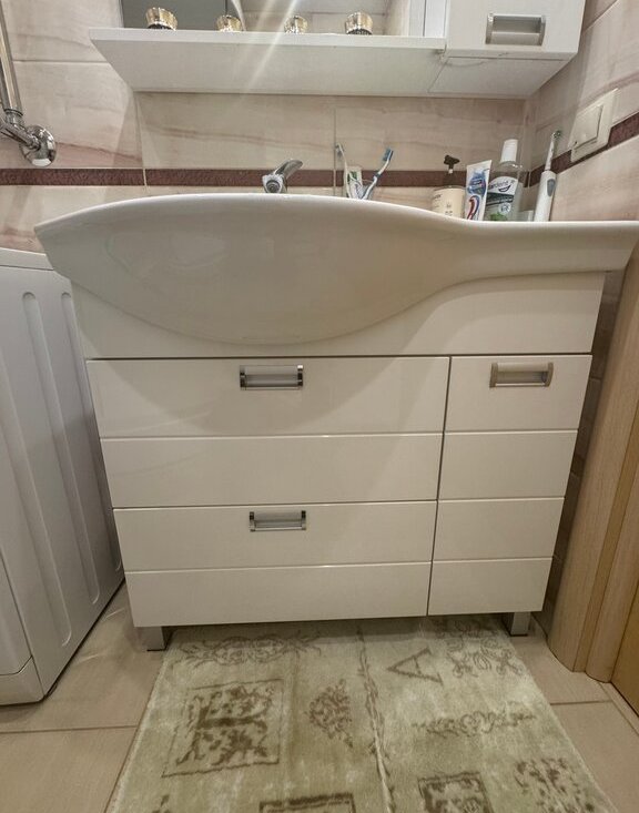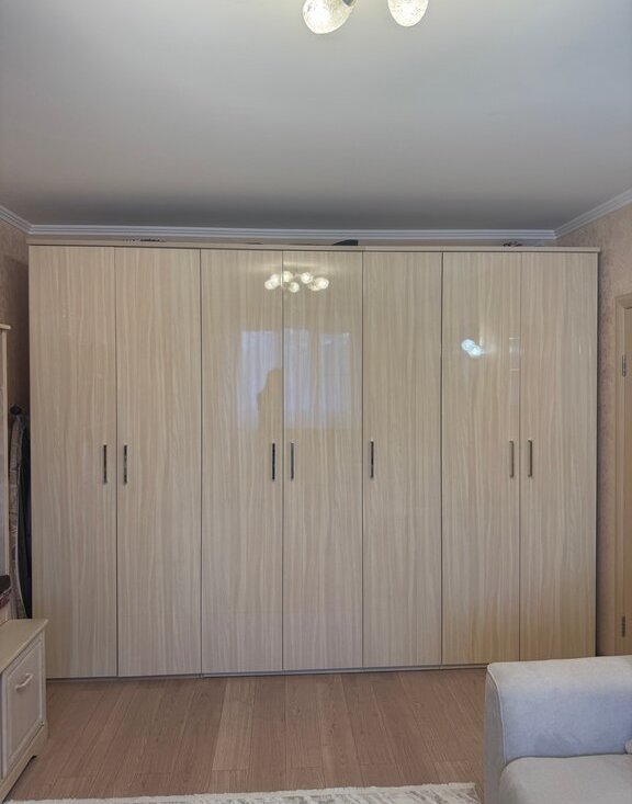 Bosch, духовой шкаф Bosch) шкаф-колонка, мойдодыр с зеркалом, водонагреватель проточный, встроенный шкаф в коридоре, в большой комнате шкаф вдоль стены, шкафы на балконе.