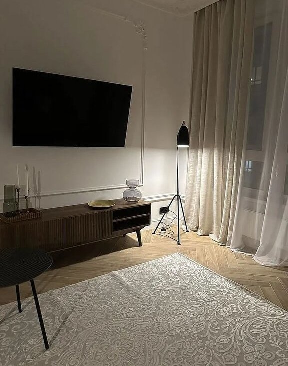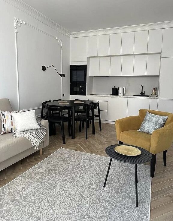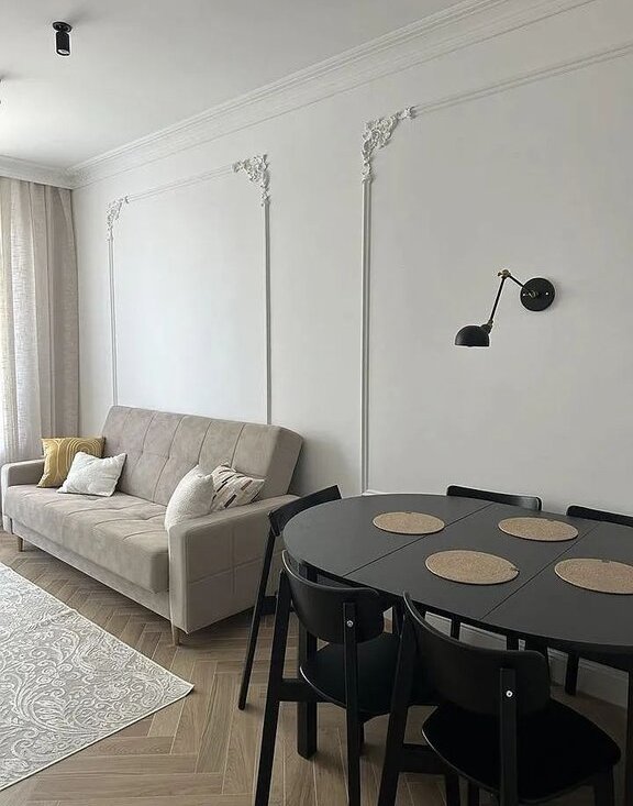 Квартира на 6 этаже, потолки 2,8 метра и панорамные окна, из которых много света. Проект дизайнерский.