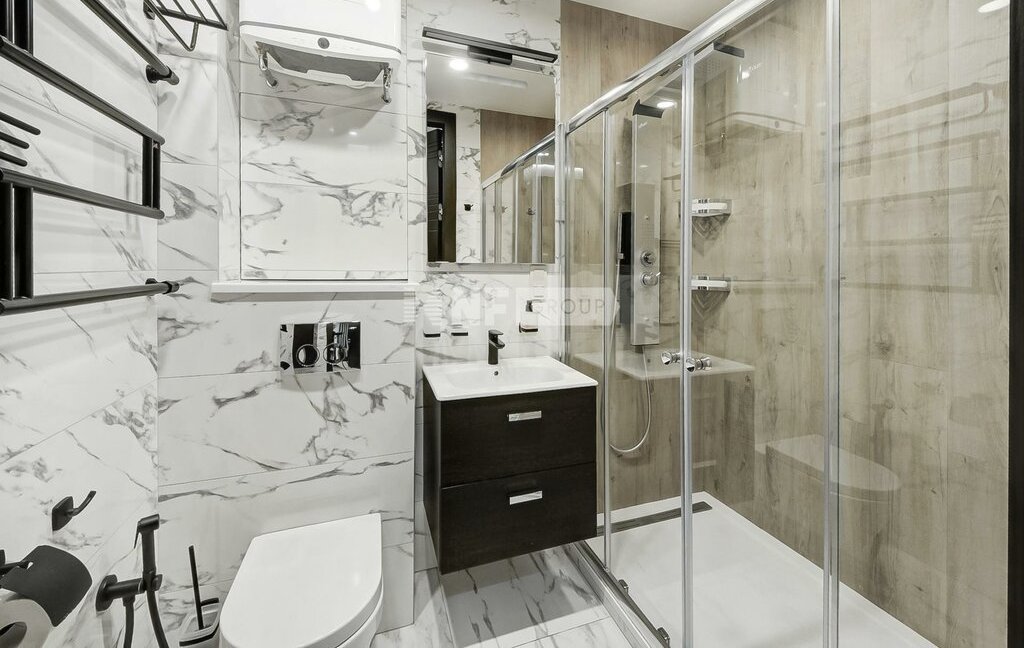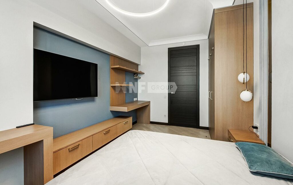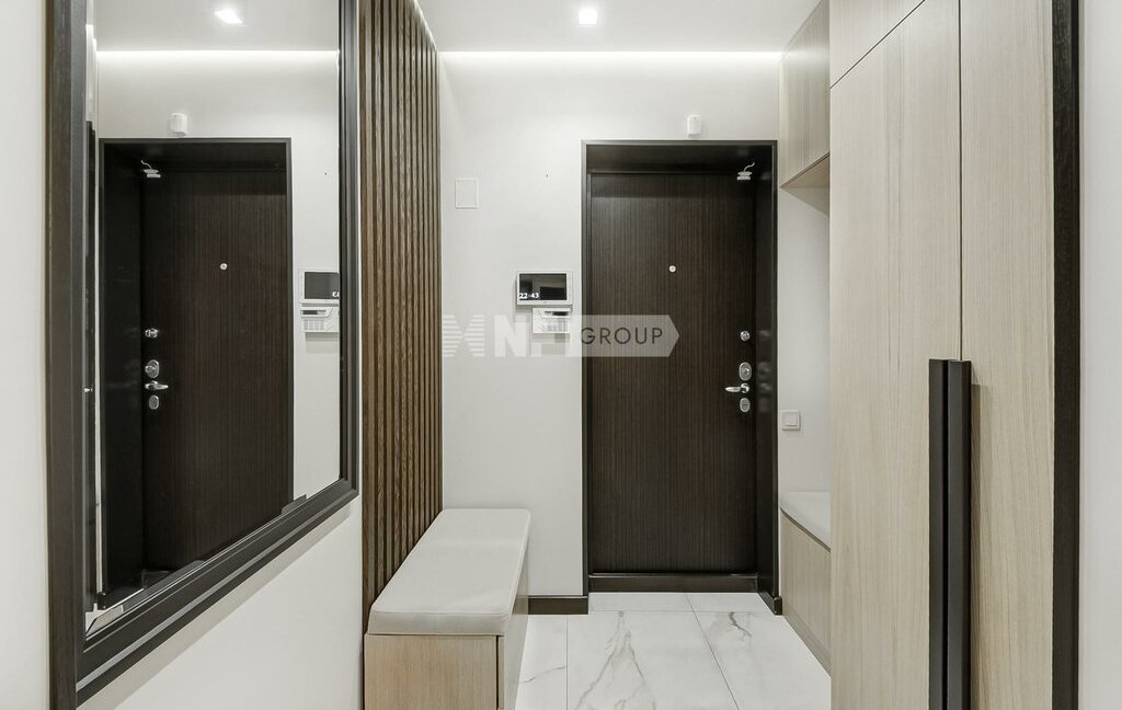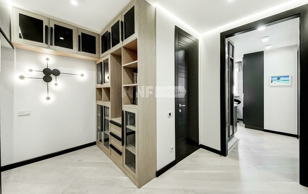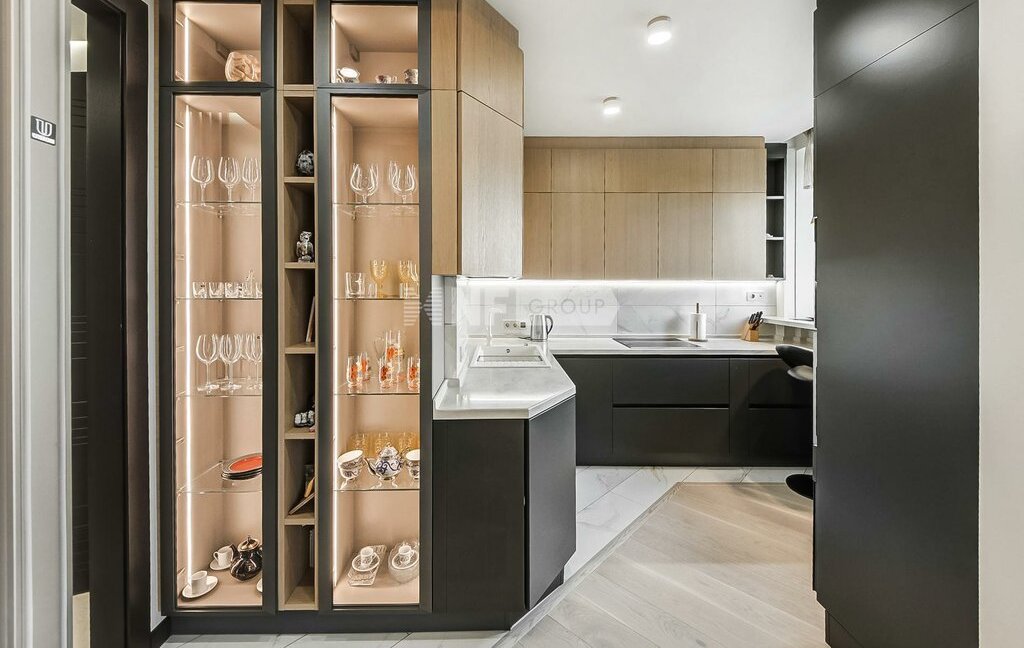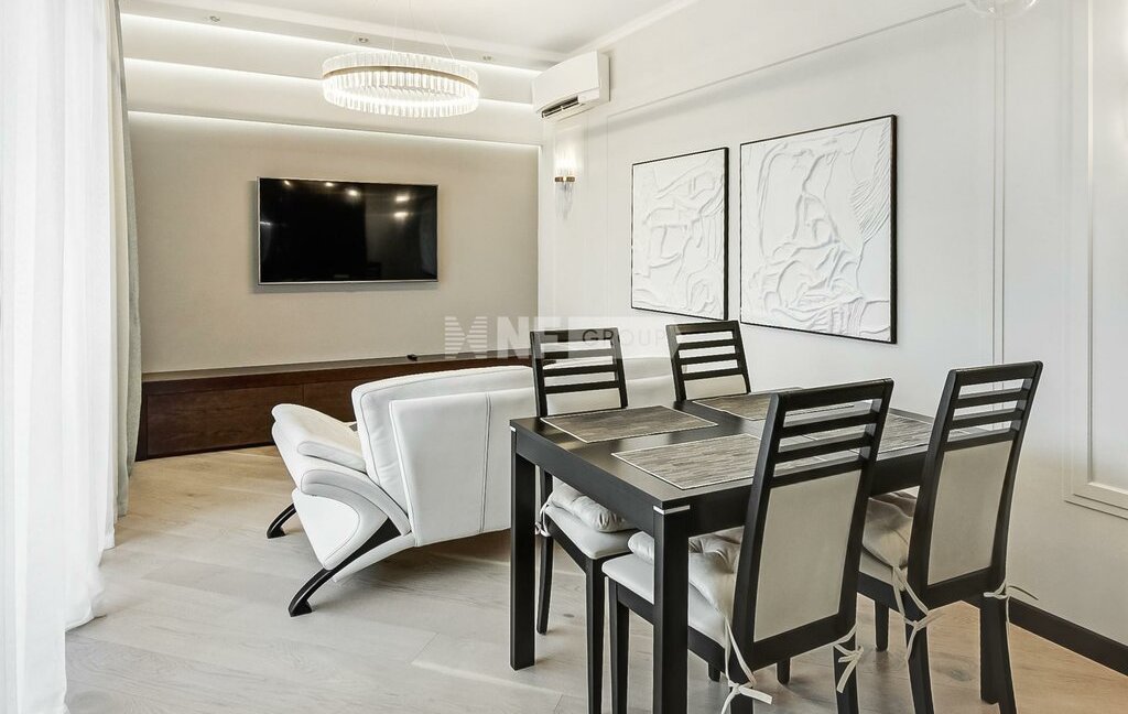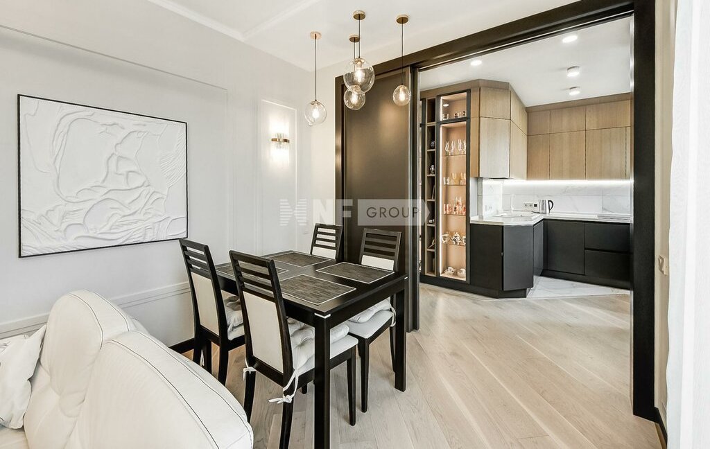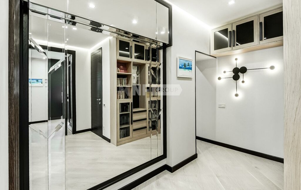 Выполнена новая отделка в стиле современной классики, квартира меблирована, установлены кондиционеры, бойлер, премиальная техника NEFF, винный бар, посудомоечная машина, кофемашина, система безопасности (сигнализация). Отделка свежая, в очень хорошем состоянии.
