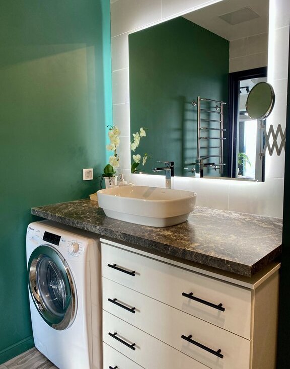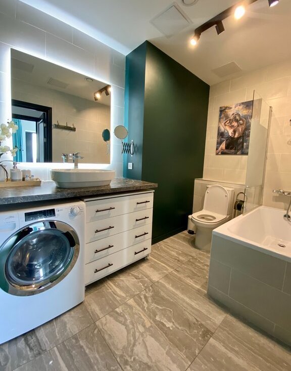 • Стильная ванная комната: много места для хранения, большое зеркало с подсветкой, качественная сантехника, стиральная машина с сушкой.
