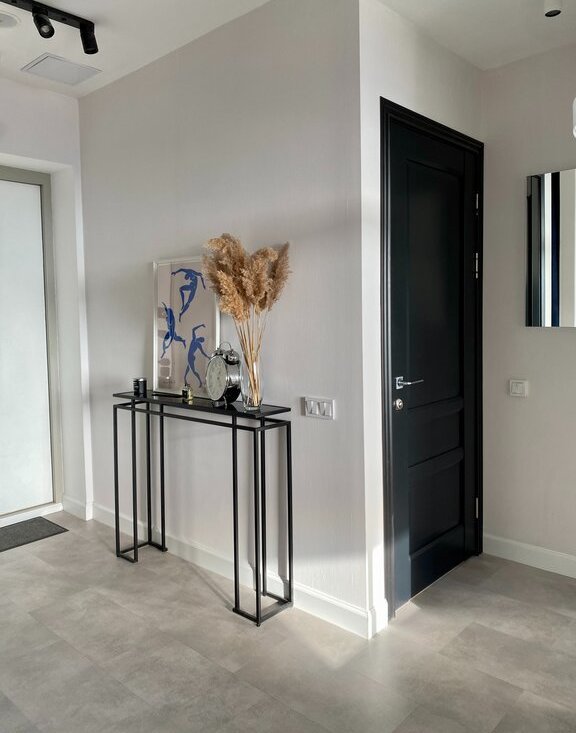 • Функциональная прихожая с консолью, зеркалом и местом для хранения. Просторная комната для хранения, в которой есть холодильник и большой стеллаж.