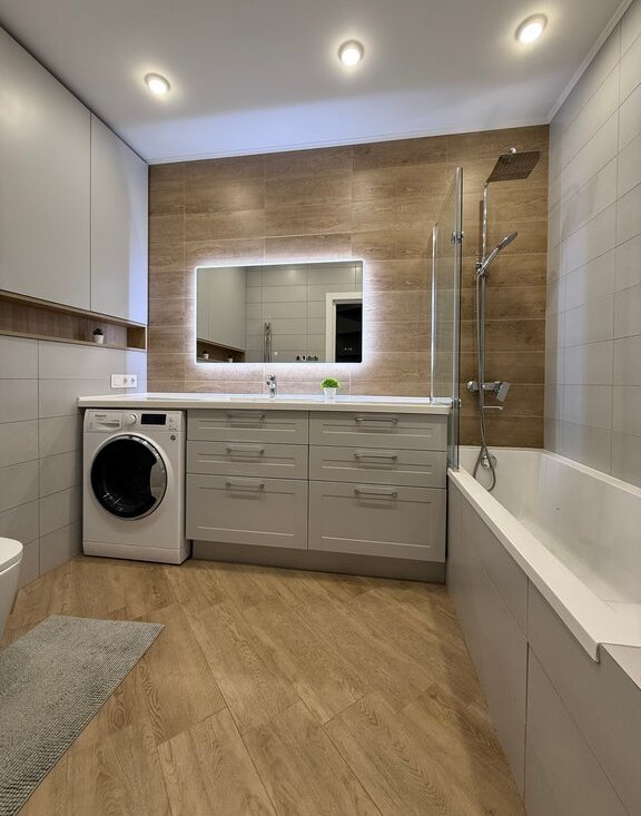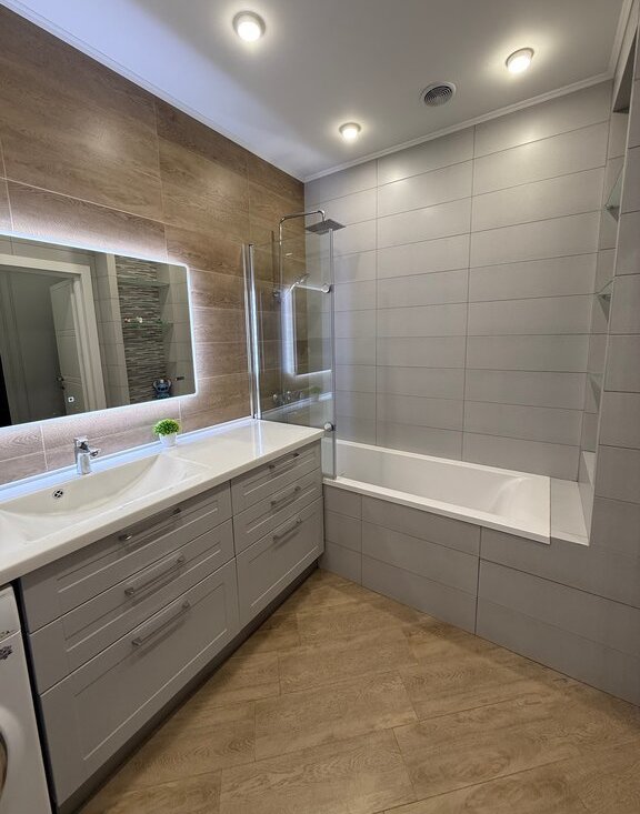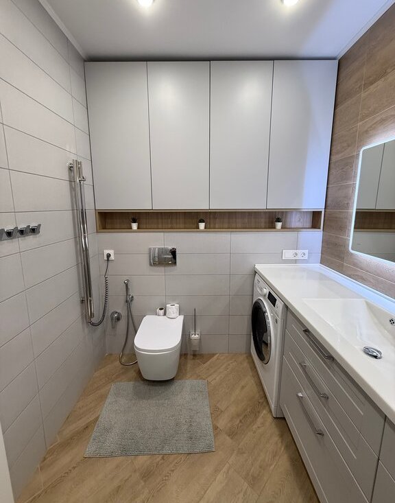 - совмещенный просторный санузел с ванной, большой столешницей, огромным зеркалом с подсветкой, теплым полом и множеством мест хранения, полотенцесушителем, стиральная машина с функцией сушки;