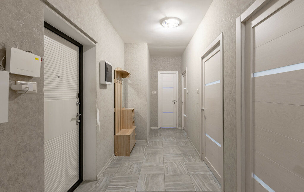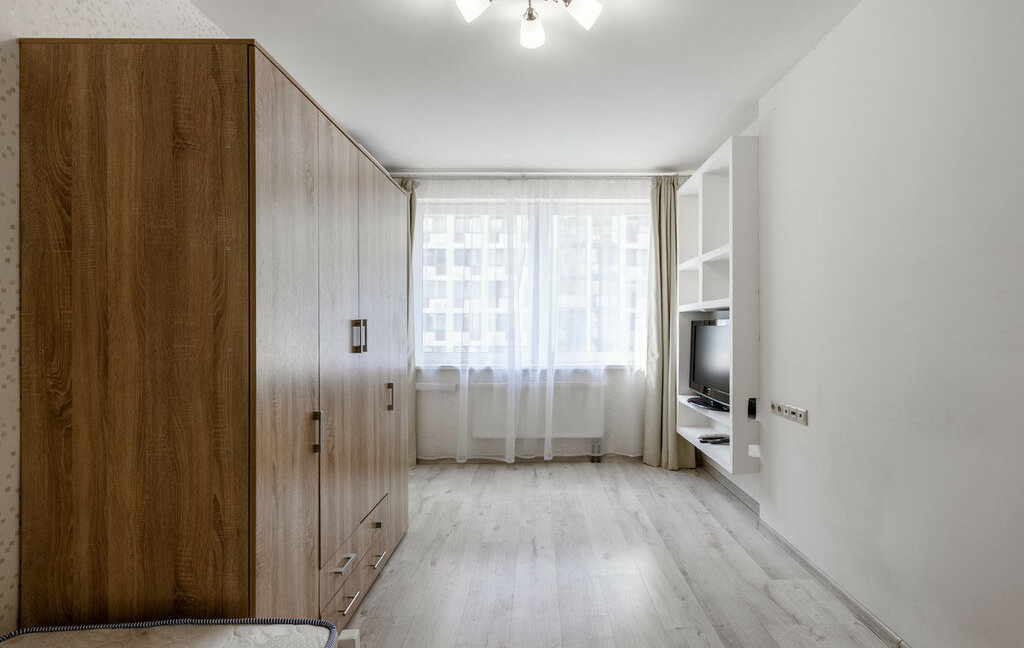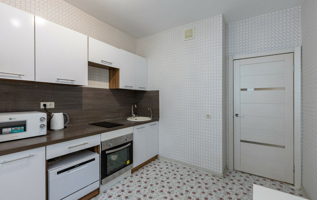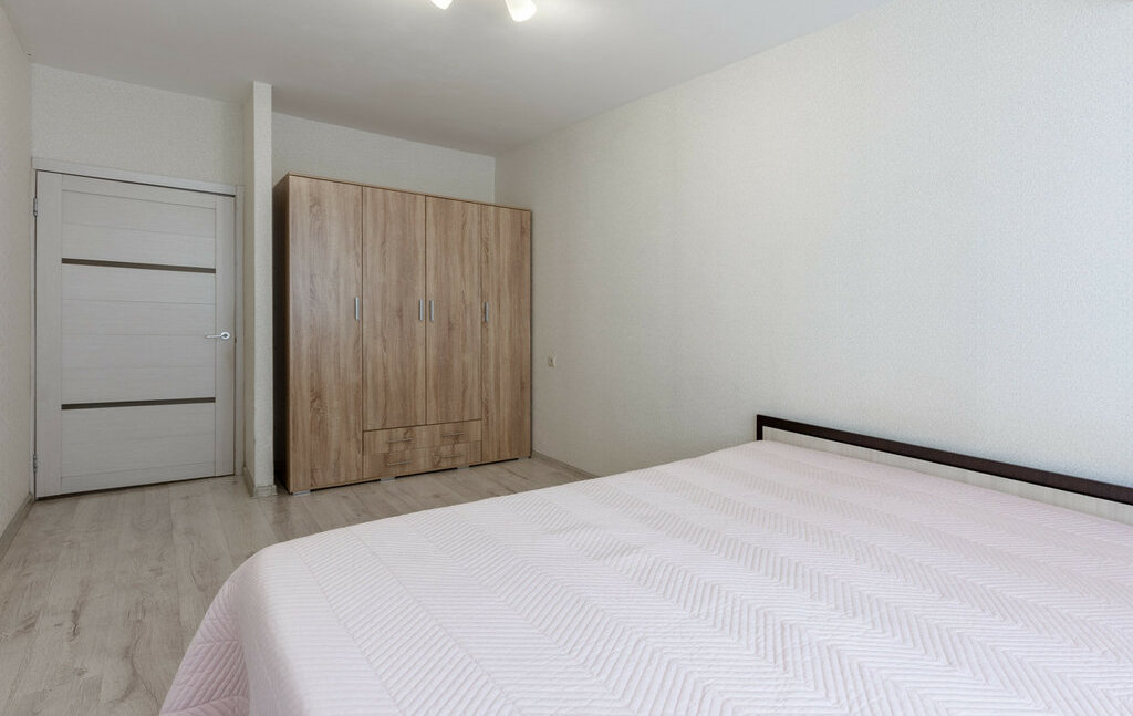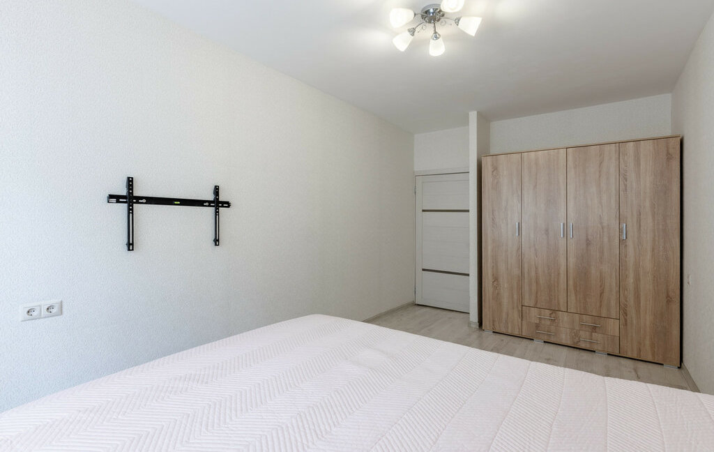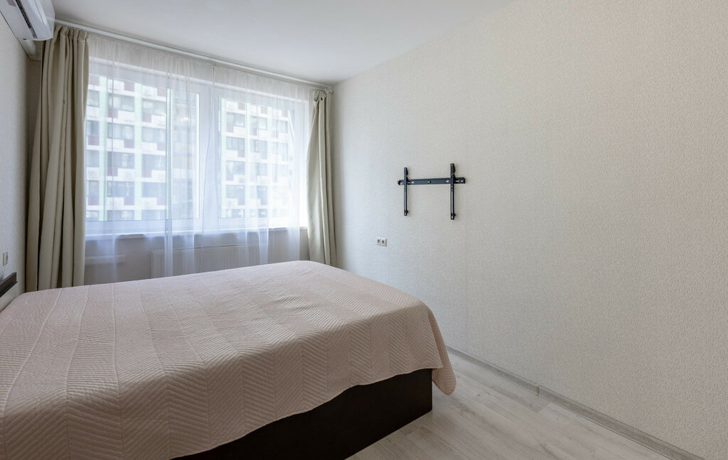Квартира полностью готова к комфортному проживанию. Установлен кондиционер для поддержания идеального климата.Родительская спальня: просторная двуспальная кровать с ортопедическим матрасом и вместительный гардеробный шкаф.Детская комната: две односпальные кровати, шкаф для вещей, телевизор. Кухня: кухонный гарнитур, оснащенный всей необходимой бытовой техникой. Из кухни есть выход на застекленную лоджию.Вид из окон: Окна выходят на тихую пешеходную аллею внутри комплекса — никакого шума машин и пыли дорог.
