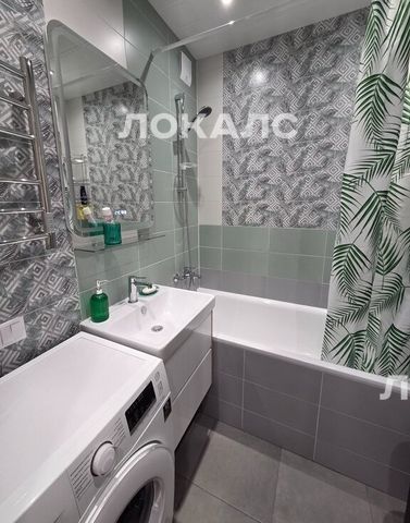В ванной комнате есть ванная, раковина, тумба, стиральная машина, шкаф для хранения вещей, электрический полотенцесушитель с регулятором и таймером.