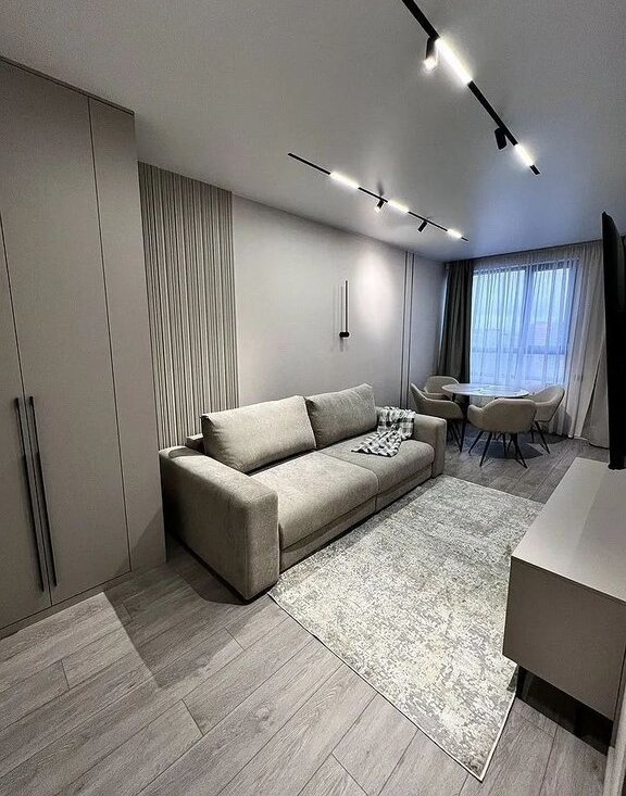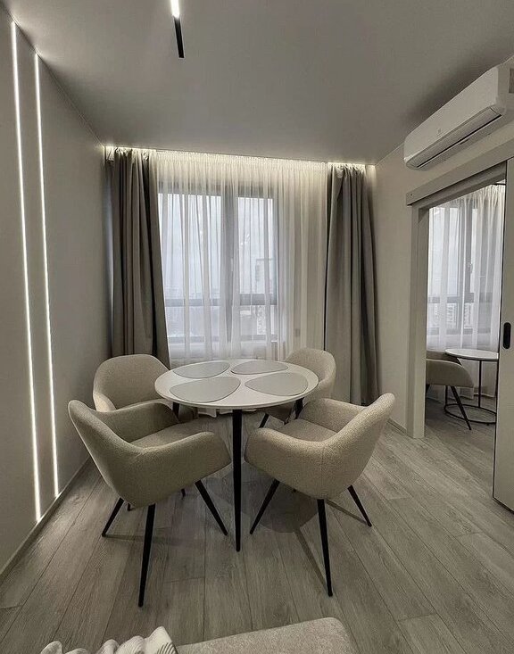 В квартире все продумано для комфортного проживания: разнообразная подсветка зон, электрокарнизы, домофон, wi-fi, чайник, фильтр для питьевой воды барьер и даже утюг. Восхитительный вид на город.