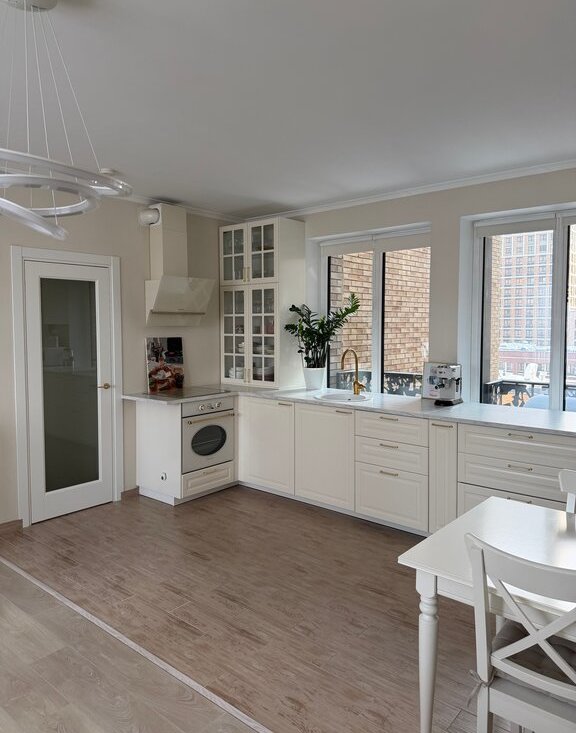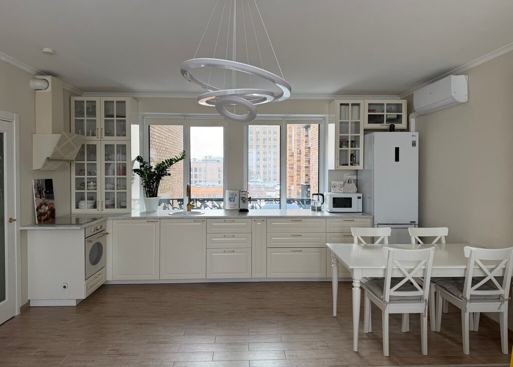 Очень просторная кухня-гостиная, более 30 кв.м., укомплектованная всей необходимой техникой. Кухонная зона около 5 метров в длину с раковинной у окна и видом на ЖК - мечта любой хозяйки. Кухня укомплектована всей необходимой техникой. Мебель и встроенная техника остается.