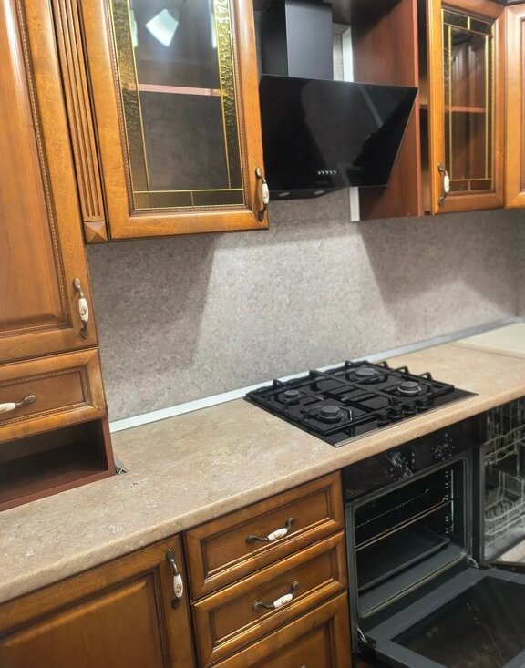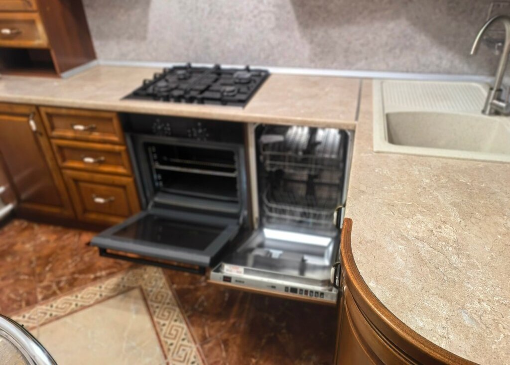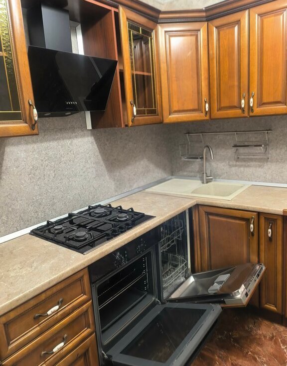 На кухне установлена современная бытовая техника: холодильник, варочная панель, вытяжка, духовой шкаф и посудомоечная машина.