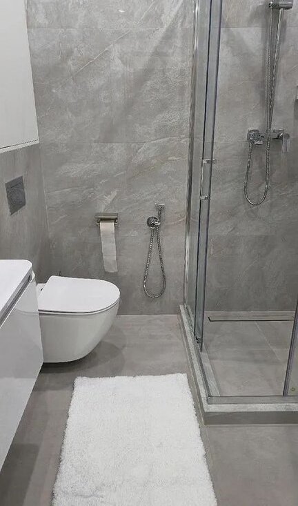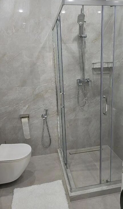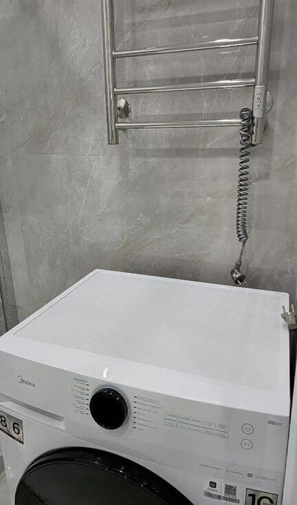 Стиральная машина. Душевая кабина. Большое зеркало.