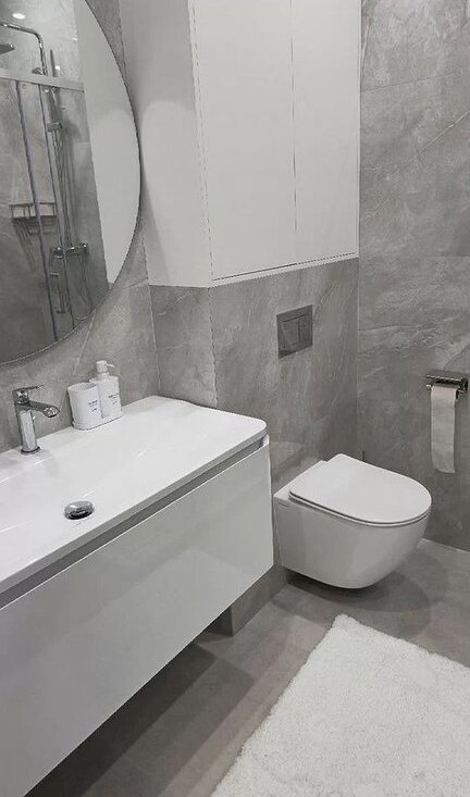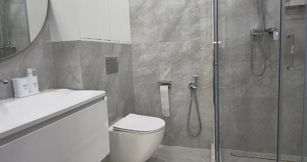 Просторная ванная комната, совмещенная с туалетной зоной.