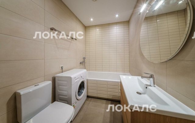 В квартире один совмещенный санузел с ванной, раковиной, зеркалом с подсветкой и стиральной машиной.