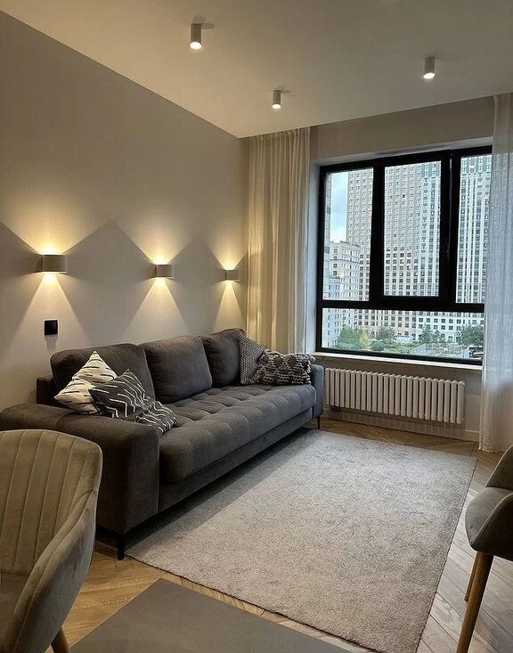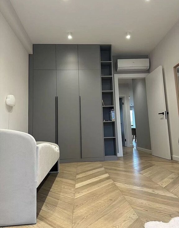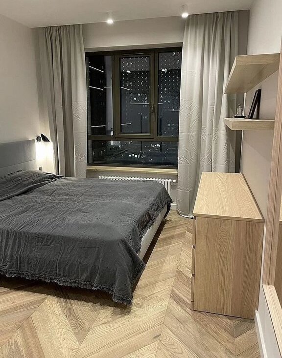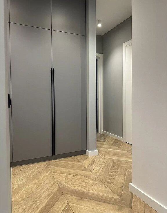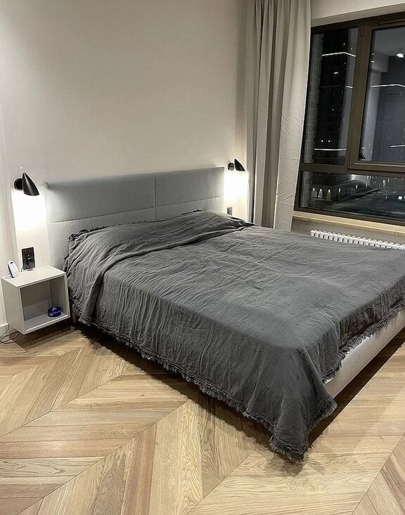 Дизaйнepский pемонт от архбюро Sоyuz: минималистичный дизайн, на полу инженерная доска в виде французской елки, стильная мебель и продуманное количество мест хранения. Свежий ремонт.