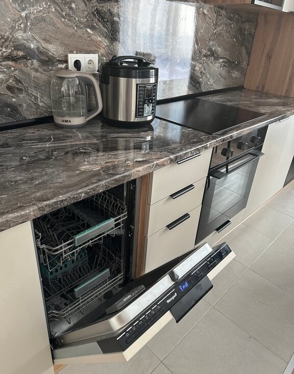 Кухнягостиная: современная мебель, встроенная техника (холодильник, плита, духовой шкаф, посудомоечная машина, вытяжка , мультиварка)