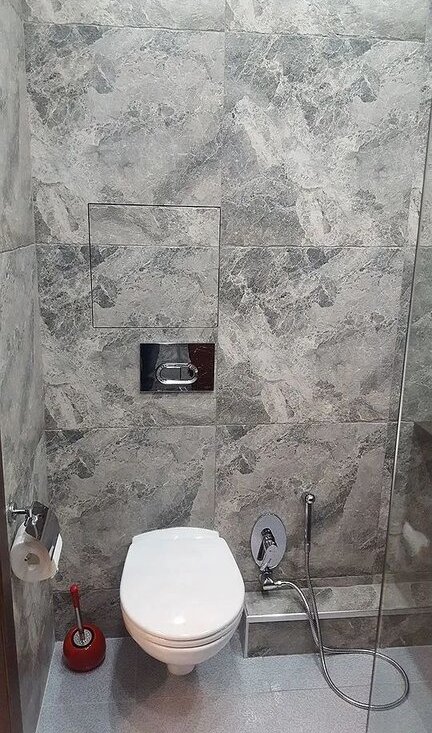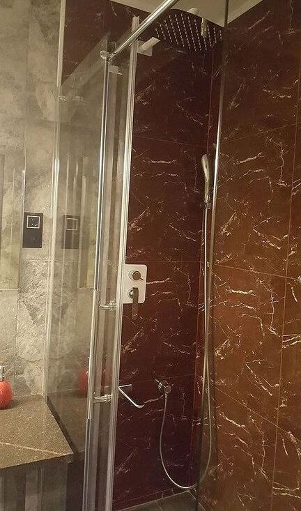 - Ванная комната с душевой кабиной со встроенным душем , Раковина на гранитной столешнице со встроенным смесителем, стиральная машина. Встроенные в потолок колонки , которые воспроизводят музыку от источника в гостиной по блутуз или с другого источника.
