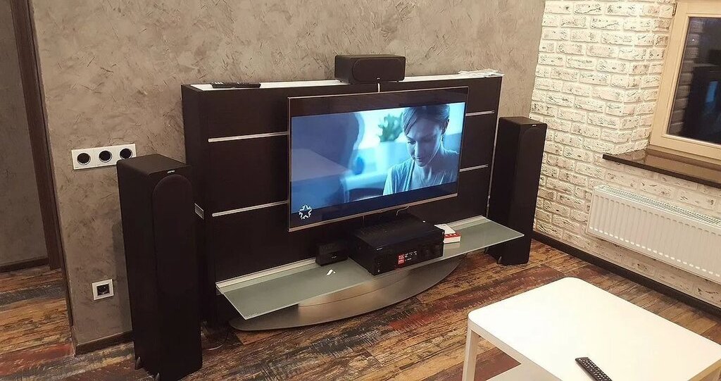 - По гостиной. Серая стена это венецианка покрытая воском. мягкая мебель от Аlbеrt&Shtеin , Итальянская Тв стойка Расini Сарреlini , Установлен домашний кинотеатр .Телевизор 55", Ресивер Sоny, колонки Jаmо.