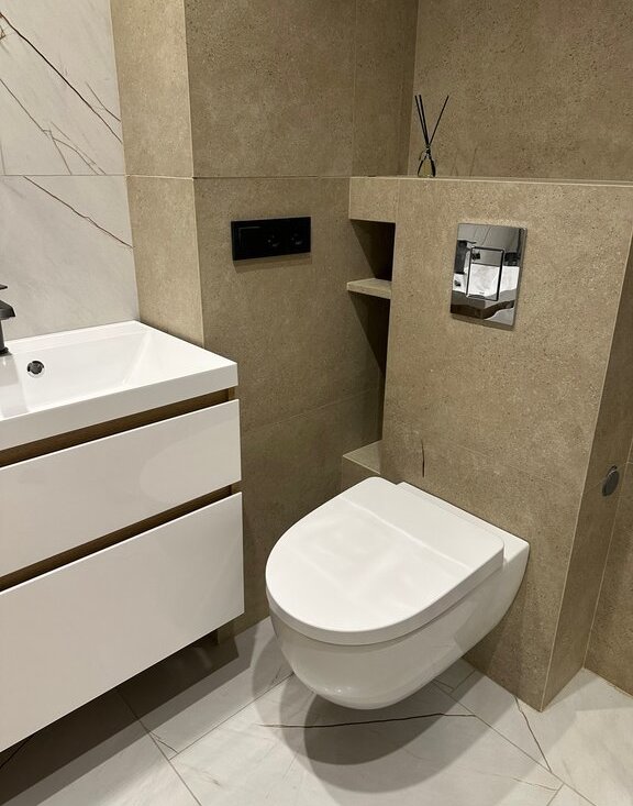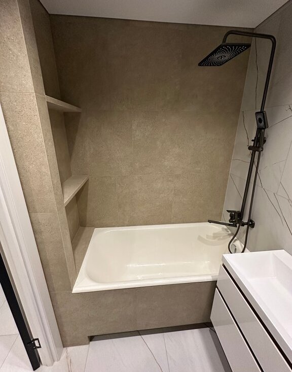🔹Санузел полностью оборудован: установлена новая сантехника — ванна с душевой системой, подвесной унитаз с инсталляцией, раковина с тумбой и зеркалом;