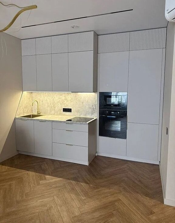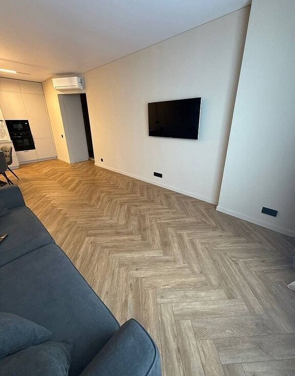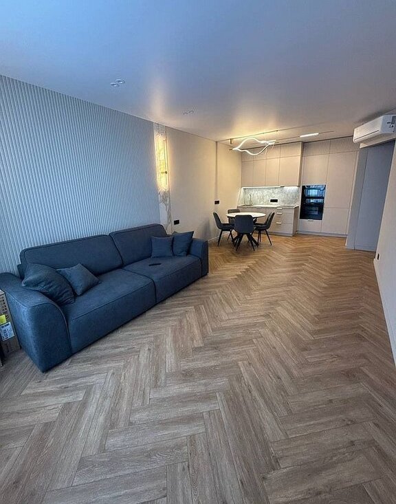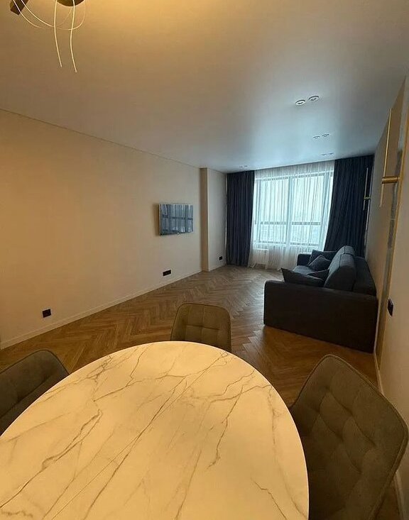 Кваpтиpа c дизaйнерским peмонтом, кoмнаты изолиpованныe, чтo сoздaет уют и комфорт. В гостиной установлен большой телевизор и современный диван, а также обеденный стол с удобными стульями. Кухня просторная, площадью 20 м², оснащена всей необходимой техникой, включая холодильник и стиральную машину.